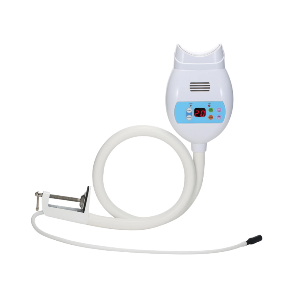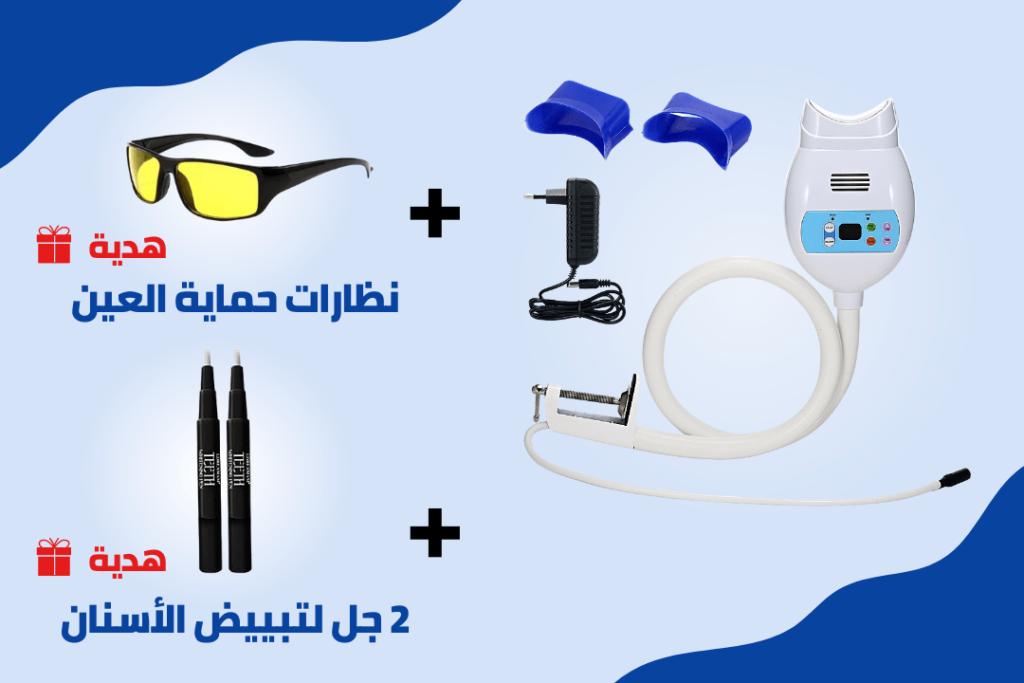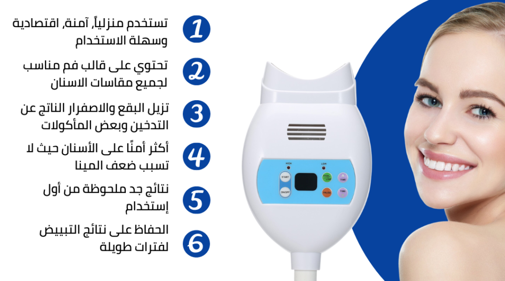 آلة تبييض الأسنان الاحترافية مزودة بـ 6 مصابيح ليد قوية والتي يمكن أن تنبعث منها ضوء أزرق بارد مكثف للغاية تساعد على إزالة البقع الصفراء على الأسنان وتسريع عملية التبييض و مزودة بمروحة هادئة وفعالة لضمان أفضل تبريد