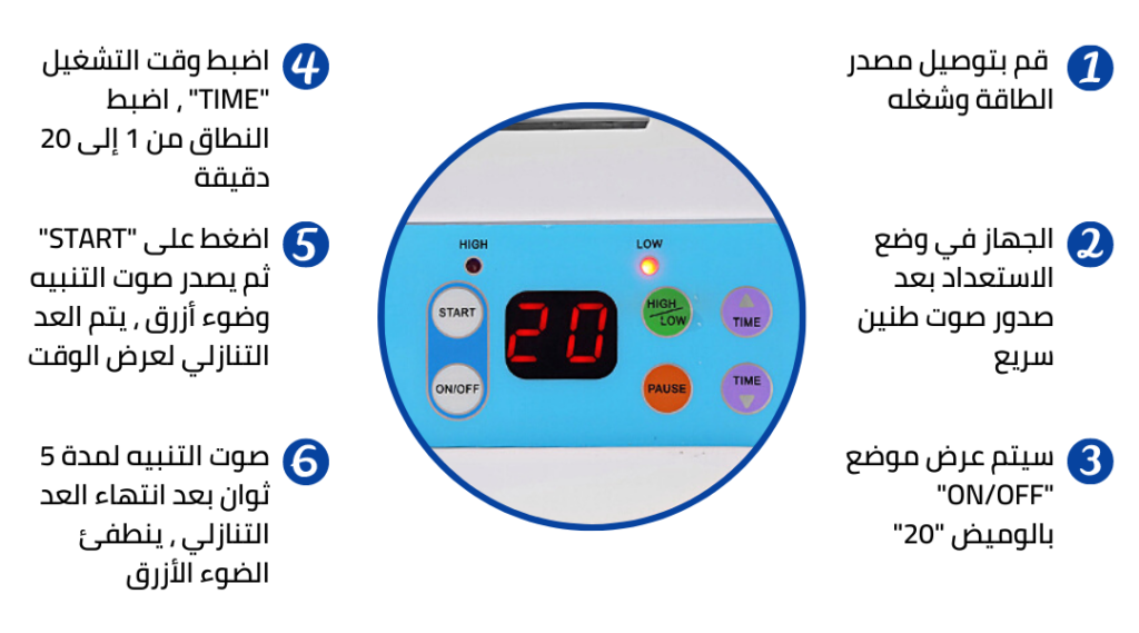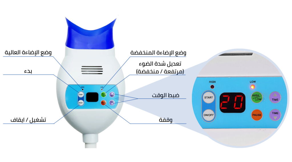 يمكن ضبط وقت عمل مصباح تبييض الأسنان في غضون 1-20 دقيقة، يمكنك ضبط الوقت وفقًا لاحتياجاتك الفعلية. يمكن لشاشة ليد إظهار وقت التبييض بوضوح وجميع المعلومات